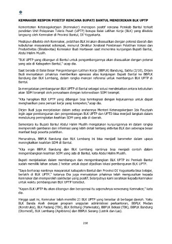 KEMNAKER RESPON POSITIF RENCANA BUPATI BANTUL MENDIRIKAN BLK UPTP
