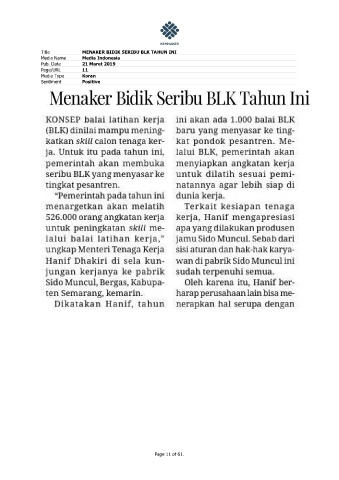 Title MENAKER BIDIK SERIBU BLK TAHUN INI Media Name Media Indonesia Pub. Date 21 Maret 2019 Page/URL 11 Media Type Koran Sentiment Positive Page 11 of 61.