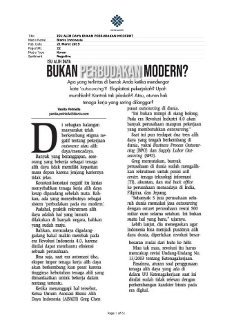 Title ISU ALIH DAYA BUKAN PERBUDAKAN MODERN? Media Name Bisnis Indonesia Pub. Date 21 Maret 2019 Page/URL 22 Media Type Koran Sentiment Negative Page 1 of 61.