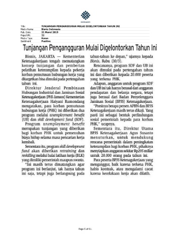 Title TUNJANGAN PENGANGGURAN MULAI DIGELONTORKAN TAHUN INI Media Name Bisnis Indonesia Pub. Date 21 Maret 2019 Page/URL 22 Media Type Koran Sentiment Positive Page 5 of 61.
