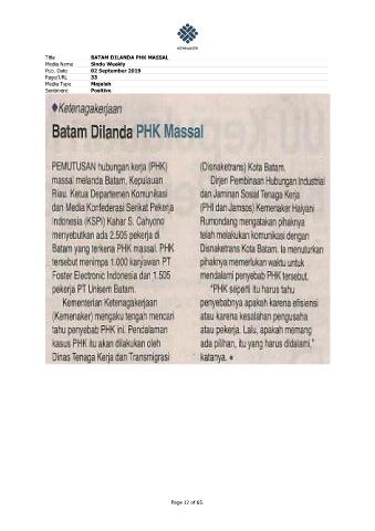 Title BATAM DILANDA PHK MASSAL Media Name Sindo Weekly Pub. Date 02 September 2019 Page/URL 33 Media Type Majalah Sentiment Positive Page 12 of 65.