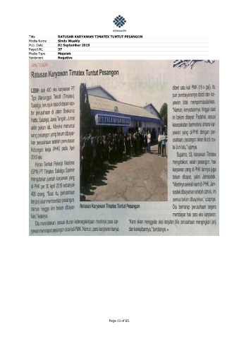 Title RATUSAN KARYAWAN TIMATEX TUNTUT PESANGON Media Name Sindo Weekly Pub. Date 02 September 2019 Page/URL 37 Media Type Majalah Sentiment Negative Page 13 of 65.