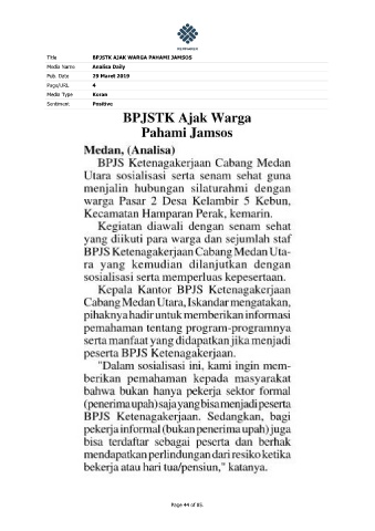 Title BPJSTK AJAK WARGA PAHAMI JAMSOS Media Name Analisa Daily Pub. Date 29 Maret 2019 Page/URL 4 Media Type Koran Sentiment Positive Page 44 of 85.