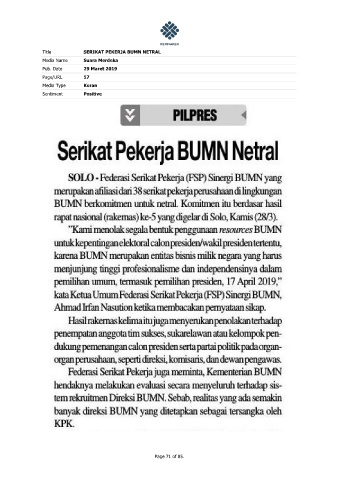 Title SERIKAT PEKERJA BUMN NETRAL Media Name Suara Merdeka Pub. Date 29 Maret 2019 Page/URL 17 Media Type Koran Sentiment Positive Page 71 of 85.