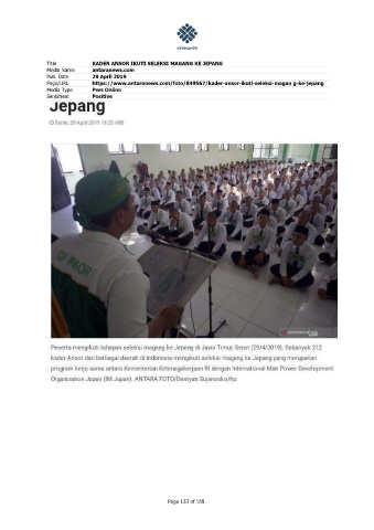 Title KADER ANSOR IKUTI SELEKSI MAGANG KE JEPANG Media Name antaranews.com Pub. Date 29 April 2019 Page/URL https://www.antaranews.com/foto/849567/kader-ansor-ikuti-seleksi-magan g-ke-jepang Media Type Pers Online Sentiment Positive Page 133 of 159.