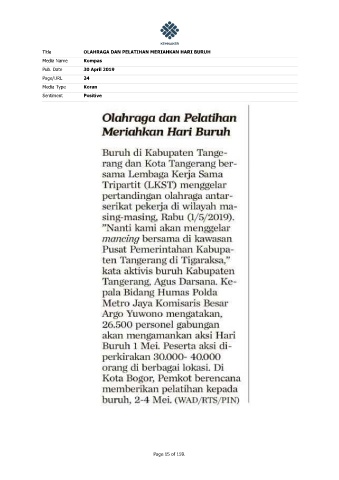 Title OLAHRAGA DAN PELATIHAN MERIAHKAN HARI BURUH Media Name Kompas Pub. Date 30 April 2019 Page/URL 24 Media Type Koran Sentiment Positive Page 15 of 159.