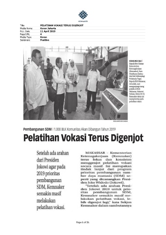Title PELATIHAN VOKASI TERUS DIGENJOT Media Name Koran Jakarta Pub. Date 11 April 2019 Page/URL 4 Media Type Koran Sentiment Positive Page 6 of 59.