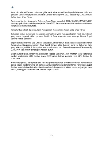 perihal pelaksanaan UMK Jember tahun 2022 tertulis bahwa meminta revisi UMK Jember Rp