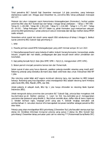 Total penerima BLT Subsidi Gaji Desember mencapai 1,6 juta penerima, yang beberapa
