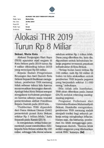 Title ALOKASI THR 2019 TURUN RP 8 MILIAR Media Name Warta Kota Pub. Date 24 Mei 2019 Page/URL 12 Media Type Koran Sentiment Positive Page 19 of 124.