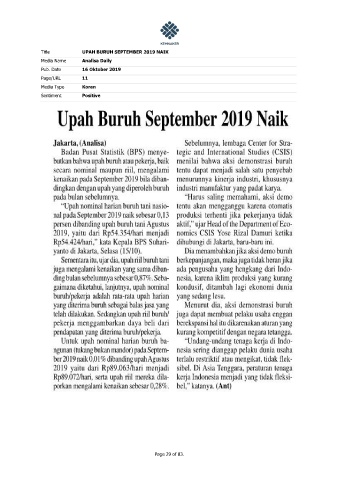Title UPAH BURUH SEPTEMBER 2019 NAIK Media Name Analisa Daily Pub. Date 16 Oktober 2019 Page/URL 11 Media Type Koran Sentiment Positive Page 29 of 83.