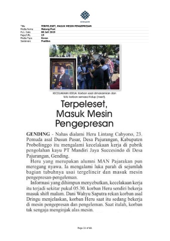 Title TERPELESET, MASUK MESIN PENGEPRESAN Media Name Malang Post Pub. Date 08 Juli 2019 Page/URL 19 Media Type Koran Sentiment Positive Page 33 of 68.