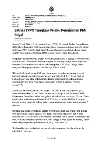 Dirtipidum Bareskrim Polri, Brigjen Nico Afinta mengatakan, Satgas TPPO menerima