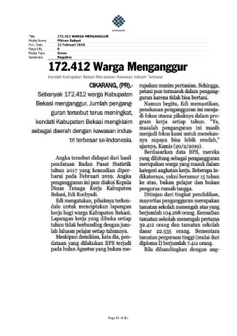 Title 172.412 WARGA MENGANGGUR Media Name Pikiran Rakyat Pub. Date 22 Februari 2019 Page/URL 6 Media Type Koran Sentiment Negative Page 61 of 85.