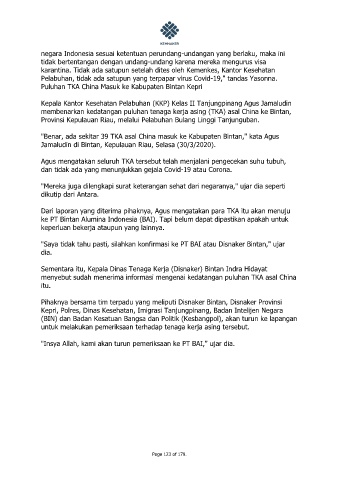 membenarkan kedatangan puluhan tenaga kerja asing (TKA) asal China ke Bintan,