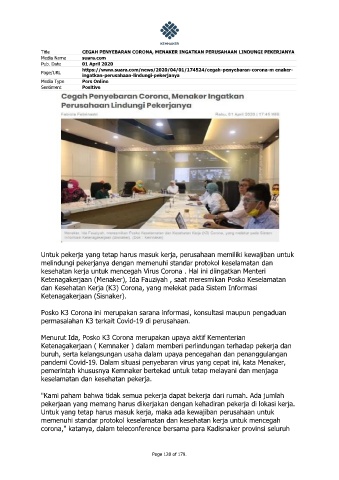 Title CEGAH PENYEBARAN CORONA, MENAKER INGATKAN PERUSAHAAN LINDUNGI PEKERJANYA