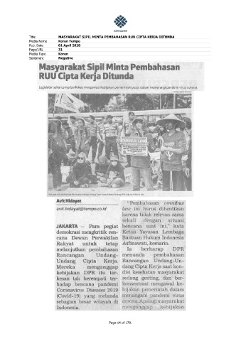 Title MASYARAKAT SIPIL MINTA PEMBAHASAN RUU CIPTA KERJA DITUNDA Media Name Koran Tempo Pub. Date 01 April 2020 Page/URL 31 Media Type Koran Sentiment Negative Page 14 of 179.