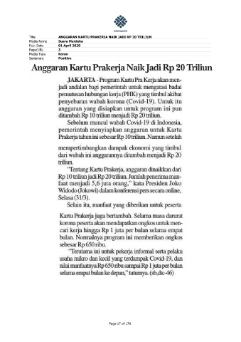 Title ANGGARAN KARTU PRAKERJA NAIK JADI RP 20 TRILIUN Media Name Suara Merdeka Pub. Date 01 April 2020 Page/URL 3 Media Type Koran Sentiment Positive Page 17 of 179.