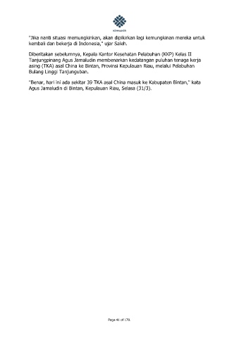 "Benar, hari ini ada sekitar 39 TKA asal China masuk ke Kabupaten Bintan," kata
