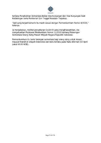 Permenkumham itu berisi larangan sementara bagi orang asing untuk masuk