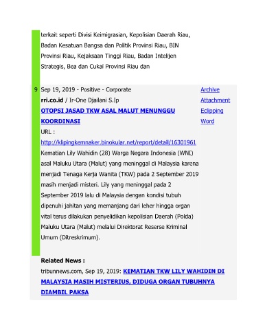 tribunnews.com, Sep 19, 2019: KEMATIAN TKW LILY WAHIDIN DI