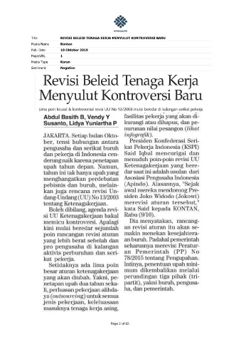Title REVISI BELEID TENAGA KERJA MENYULUT KONTROVERSI BARU Media Name Kontan Pub. Date 10 Oktober 2019 Page/URL 1 Media Type Koran Sentiment Negative Page 2 of 82.
