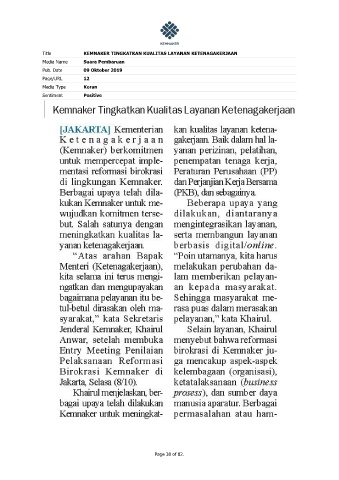 Title KEMNAKER TINGKATKAN KUALITAS LAYANAN KETENAGAKERJAAN Media Name Suara Pembaruan Pub. Date 09 Oktober 2019 Page/URL 12 Media Type Koran Sentiment Positive Page 38 of 82.