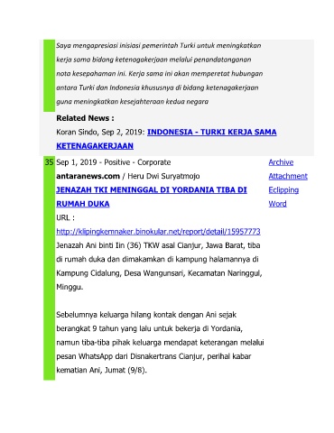 Koran Sindo, Sep 2, 2019: INDONESIA - TURKI KERJA SAMA