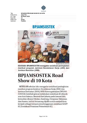 Title BPJAMSOSTEK ROAD SHOW DI 10 KOTA Media Name Jawa Pos Pub. Date 06 Maret 2020 Page/URL 11 Media Type Koran Sentiment Positive Page 13 of 126.