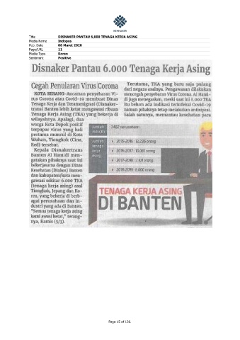 Title DISNAKER PANTAU 6,000 TENAGA KERJA ASING Media Name Indopos Pub. Date 06 Maret 2020 Page/URL 11 Media Type Koran Sentiment Positive Page 15 of 126.