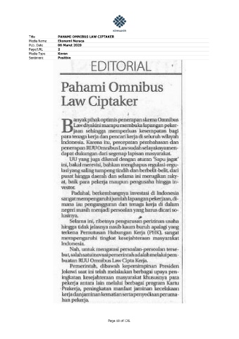 Title PAHAMI OMNIBUS LAW CIPTAKER Media Name Ekonomi Neraca Pub. Date 06 Maret 2020 Page/URL 2 Media Type Koran Sentiment Positive Page 18 of 126.