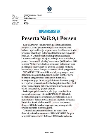 Title PESERTA NAIK 9,1 PERSEN Media Name Jawa Pos Pub. Date 06 Februari 2020 Page/URL 15 Media Type Koran Sentiment Positive Page 4 of 130.