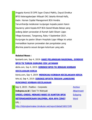 detik.com, Sep 4, 2019: DIREKSI BPJS TK JENGUK KORBAN