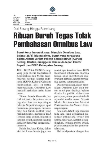 Title RIBUAN BURUH TEGAS TOLAK PEMBAHASAN OMNIBUS LAW Media Name Rakyat Merdeka Pub. Date 30 Januari 2020 Page/URL 11 Media Type Koran Sentiment Negative Page 2 of 87.