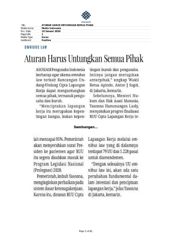 Title ATURAN HARUS UNTUNGKAN SEMUA PIHAK Media Name Media Indonesia Pub. Date 10 Januari 2020 Page/URL 1 Media Type Koran Sentiment Positive Sambungan… Page 2 of 82.