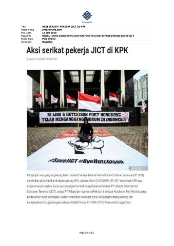 Title AKSI SERIKAT PEKERJA JICT DI KPK Media Name antaranews.com Pub. Date 15 Juli 2019 Page/URL https://www.antaranews.com/foto/957792/aksi-serikat-pekerja-jict-di-kp k Media Type Pers Online Sentiment Negative Page 50 of 62.