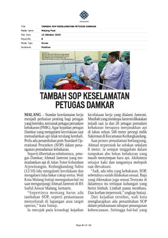 Title TAMBAH SOP KESELAMATAN PETUGAS DAMKAR Media Name Malang Post Pub. Date 15 Oktober 2019 Page/URL 8 Media Type Koran Sentiment Positive Page 40 of 136.