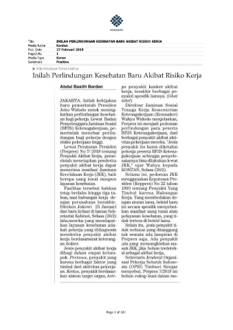 Title INILAH PERLINDUNGAN KESEHATAN BARU AKIBAT RISIKO KERJA Media Name Kontan Pub. Date 27 Februari 2019 Page/URL 1 Media Type Koran Sentiment Positive Page 1 of 107.