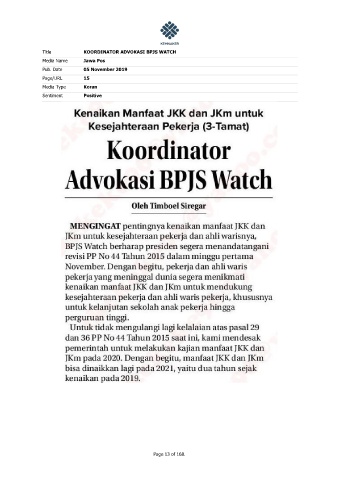 Title KOORDINATOR ADVOKASI BPJS WATCH Media Name Jawa Pos Pub. Date 05 November 2019 Page/URL 15 Media Type Koran Sentiment Positive Page 13 of 168.