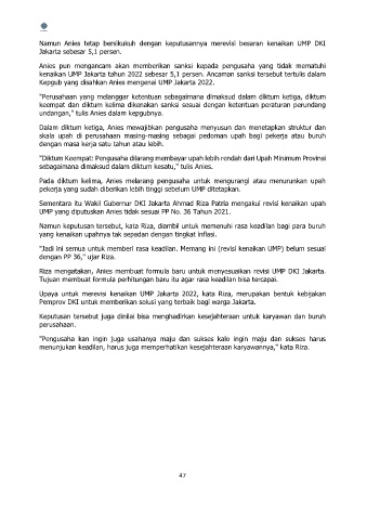 Pada diktum kelima, Anies melarang pengusaha untuk mengurangi atau menurunkan upah