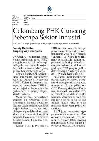 Title GELOMBANG PHK GUNCANG BEBERAPA SEKTOR INDUSTRI Media Name Kontan Pub. Date 30 Agustus 2019 Page/URL 18 Media Type Koran Sentiment Neutral Page 9 of 121.