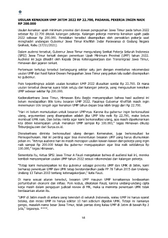 belum mendapatkan titik temu besaran UMP 2022. Pasalnya Gubernur Khofifah masih ingin