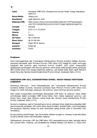 pertimbangan dalam penetapan UMP Sumsel tahun 2022 melalui keputusan gubernur, ujar