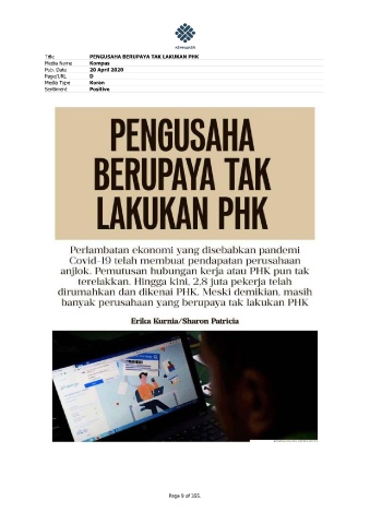 Title PENGUSAHA BERUPAYA TAK LAKUKAN PHK Media Name Kompas Pub. Date 20 April 2020 Page/URL D Media Type Koran Sentiment Positive Page 9 of 355.