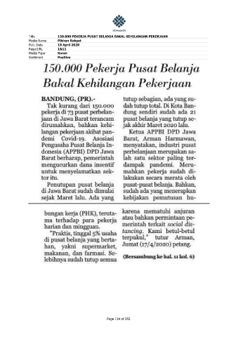 Title 150.000 PEKERJA PUSAT BELANJA BAKAL KEHILANGAN PEKERJAAN Media Name Pikiran Rakyat Pub. Date 18 April 2020 Page/URL 1&11 Media Type Koran Sentiment Positive Page 134 of 355.