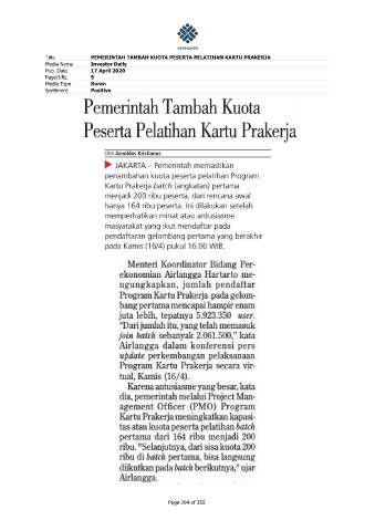 Title PEMERINTAH TAMBAH KUOTA PESERTA PELATIHAN KARTU PRAKERJA Media Name Investor Daily Pub. Date 17 April 2020 Page/URL 5 Media Type Koran Sentiment Positive Page 204 of 355.