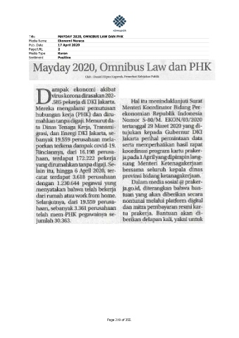 Title MAYDAY 2020, OMNIBUS LAW DAN PHK Media Name Ekonomi Neraca Pub. Date 17 April 2020 Page/URL 2 Media Type Koran Sentiment Positive Page 219 of 355.