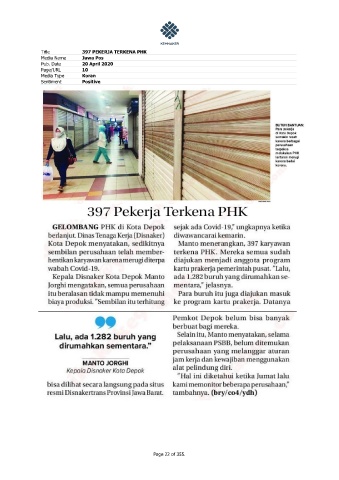 Title 397 PEKERJA TERKENA PHK Media Name Jawa Pos Pub. Date 20 April 2020 Page/URL 10 Media Type Koran Sentiment Positive Page 22 of 355.