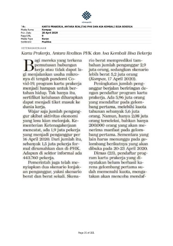 Title KARTU PRAKERJA, ANTARA REALITAS PHK DAN ASA KEMBALI BISA BEKERJA Media Name Kompas Pub. Date 20 April 2020 Page/URL 9 Media Type Koran Sentiment Positive Page 25 of 355.
