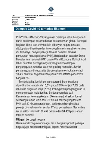 Title DAMPAK COVID-19 TERHADAP EKONOMI Media Name Media Indonesia Pub. Date 19 April 2020 Page/URL 7 Media Type Koran Sentiment Positive Page 39 of 355.